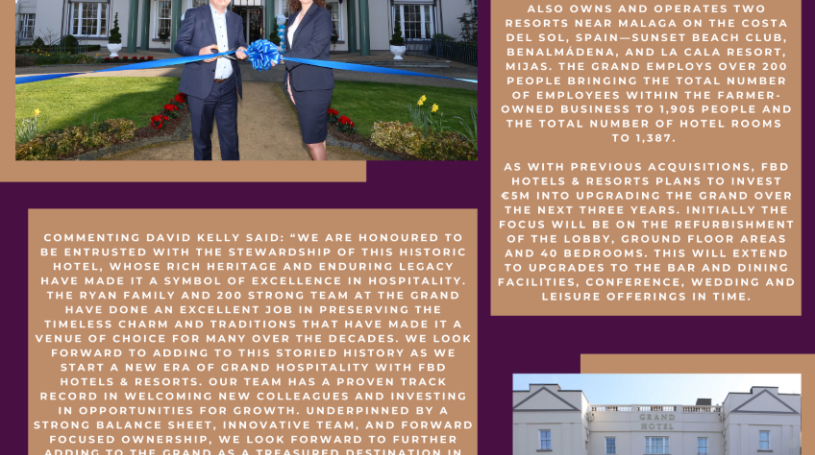 As with previous acquisitions, FBD Hotels & Resorts plans to invest €5M into upgrading The Grand over the next three years. Initially, the focus will be on the refurbishment of the lobby, ground floor areas, and 40 bedrooms. This will extend to upgrades to the bar and dining facilities, conference, wedding, and leisure offerings in time.